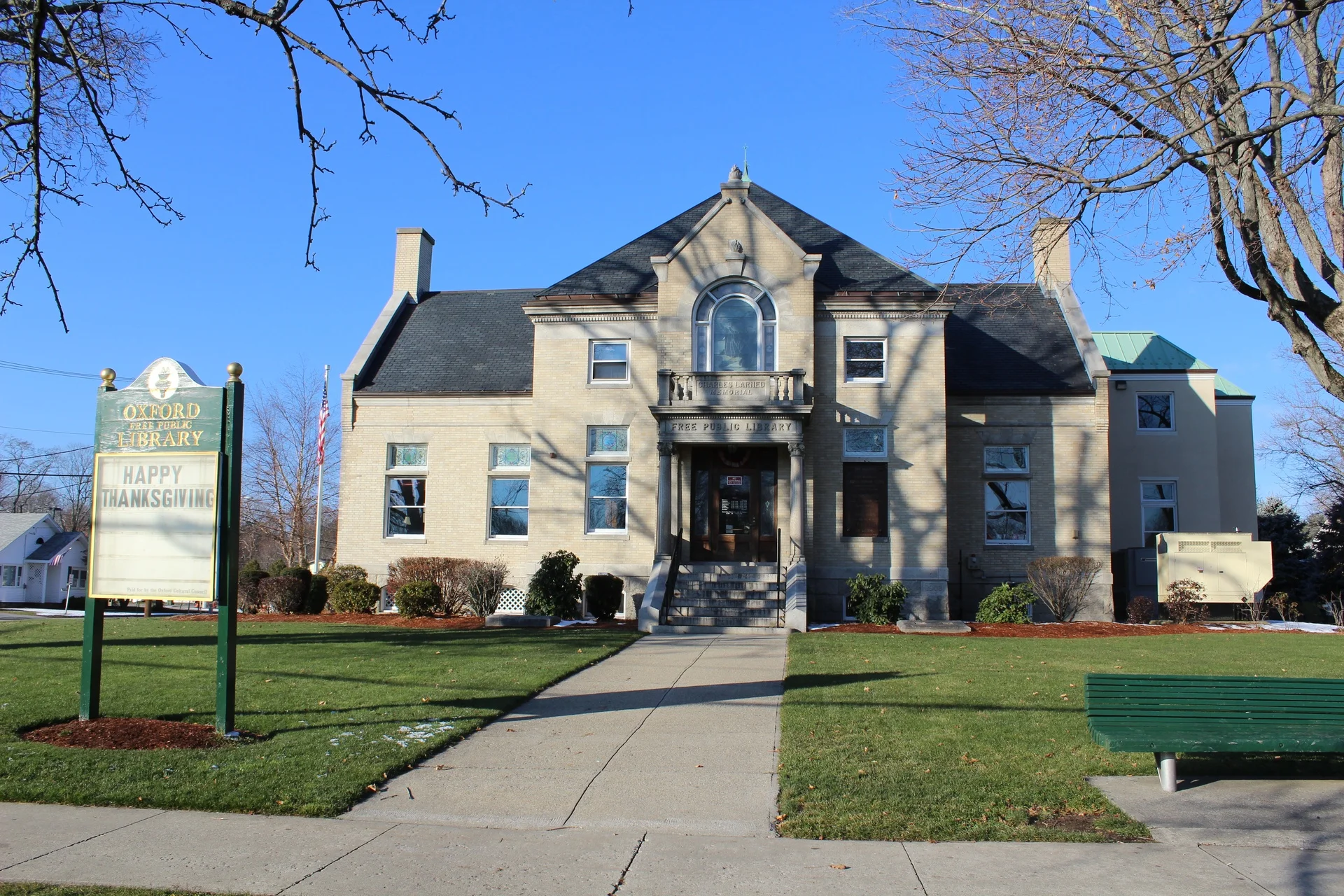 Each summer, since 2016 five to six sculptures are featured on the lawn at the Oxford Free Public Library. The Library is located in the Oxford Main Street Historic District at 339 Main Street, Oxford, Massachusetts.